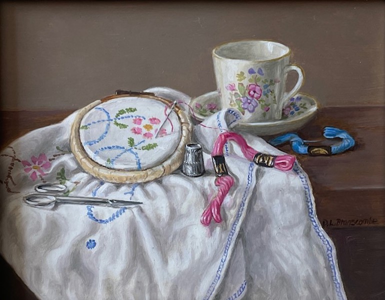 Still Life by Dianne Branscombe, Westcliffe Gallery Sheringham. 10482 Norfolk China and Clementines 3" x 4" £385