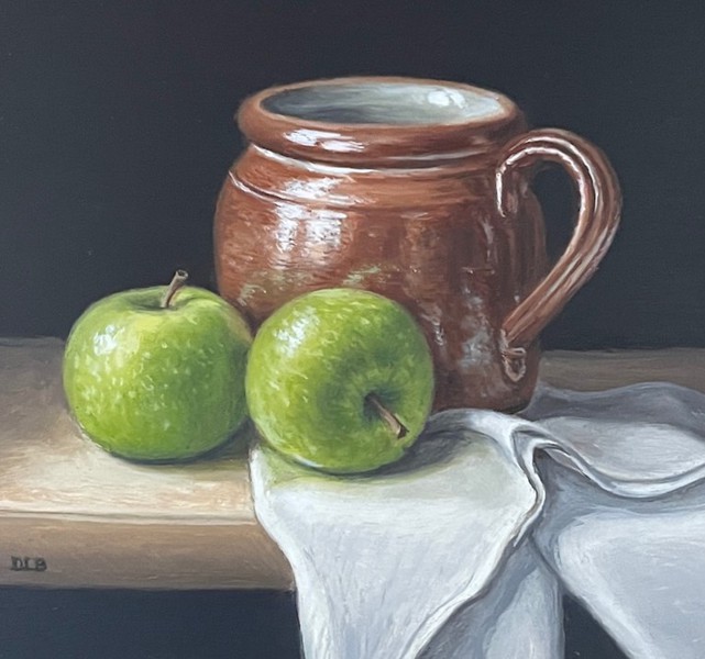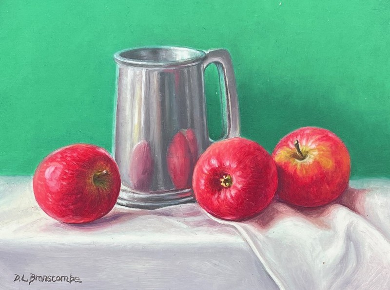 Oil by Dianne Branscombe, Westcliffe Gallery Sheringham 11219 Oil Pewter Mug & Red Apples £280