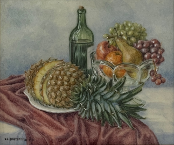 Oil by Dianne Branscombe, Westcliffe Gallery Sheringham 11220 Oil Green Bottle & Peaches £280